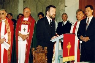 - septembril 1996. aastal allkirjastati pidulikul jumalateenistusel Tallinna Piiskoplikus Toomkirikus Porvoo leping. Paremal seisavad EELK esindajatena Porvoo-protsessis EELK Konsistooriumi esindajatena osalenud Toomas Paul ning Tiit Pädam, kõneleb Alar Laats. Nemad kandsid ette deklaratsiooni ingliskeelse teksti. Sama leping allkirjastati ka Trondheimis ja Londonis.