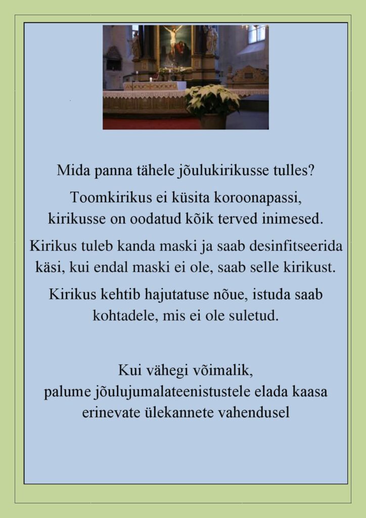 Kirikus tuleb kanda maski ja saab desinfitseerida käsi; kui endal maski ei ole, saab selle kiriku ukselt.