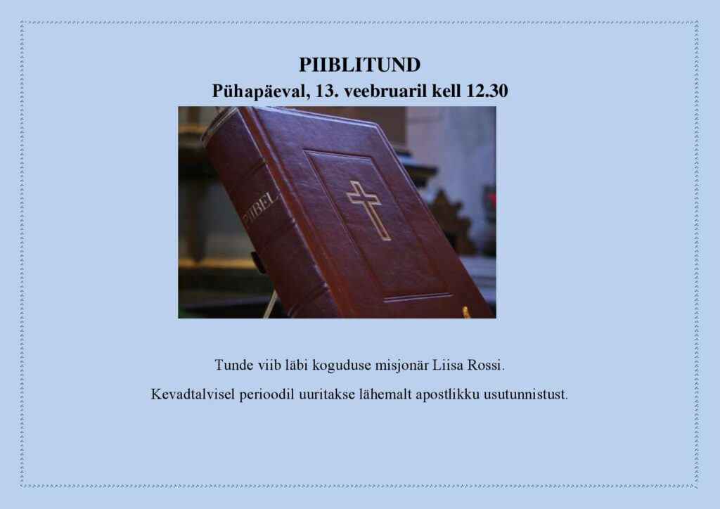 11:00 – 12:30 MISSA - 2. pühapäev pärast ilmumispüha. Jeesus ilmutab oma jumalikku väge. Õpetaja Arho Tuhkru, diakon Renè Paats, organist Piret Aidulo