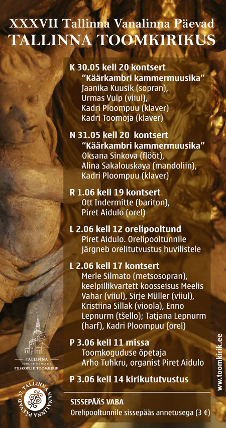 1. augustil tähistame toomkiriku Ladegasti-Saueri oreli restaureerimise 20. aastapäeva piduliku kontserdiga, kus esinevad toomkiriku ja Kaarli kiriku organist Piret Aidulo, sopran Nadia Kurem ja trompetist Indrek Vau.