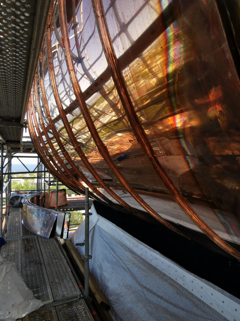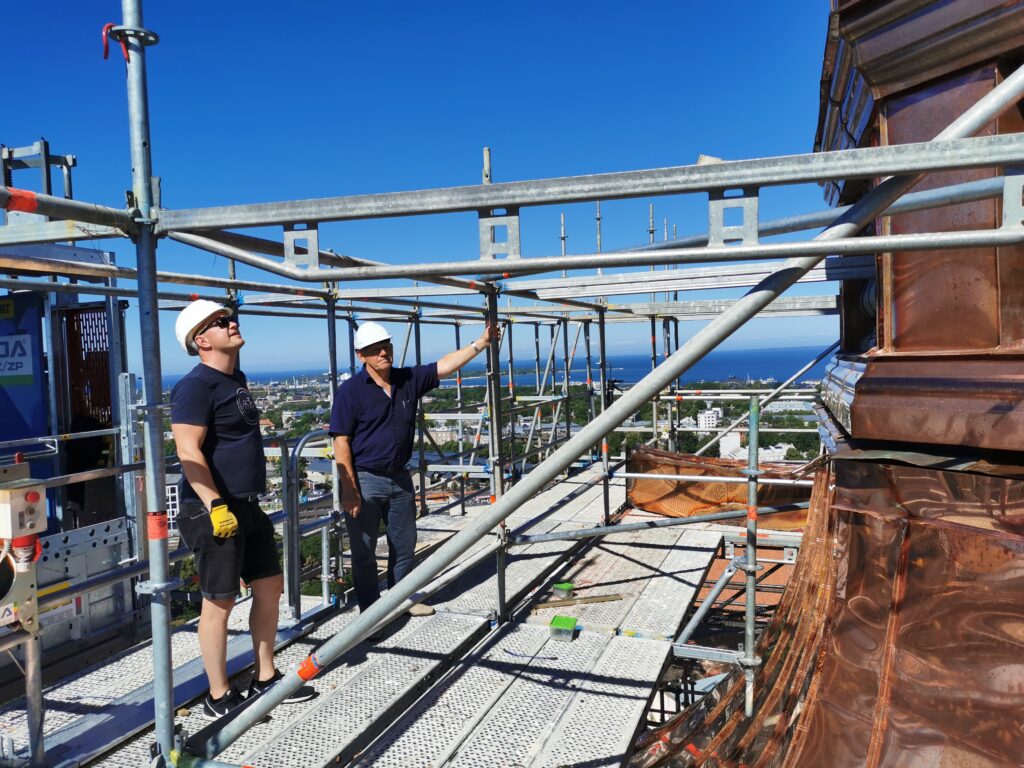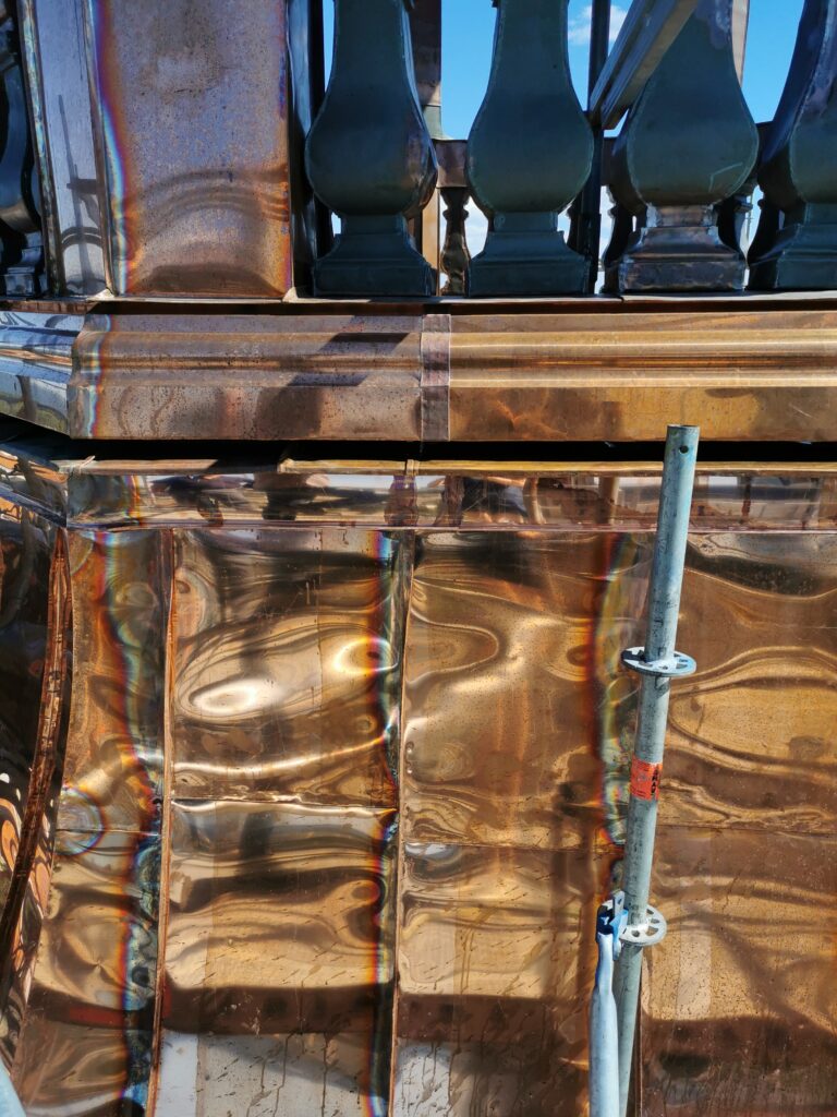Üle linna kõrguva Toomkiriku tornikiivri vaskplekiga katmine on igatahes täies hoos. Torni ülemine osa on juba valmis: kullatud tornikuul kiiskab päikese käes ja ajalooline tuulelipp vahetab asjalikult suunda, nagu poleks hiljutist vahemaandumist teinudki. Valmis on ka tornitipu kiiver ning seda toetavad kaheksa peenelt vaskplekiribadega kaetud kuuli. Lipuvardast laskub mööda tornikülge maa sisse piksekaitse. Torni vinnatud katuseplekk ootab läikivates tahvlites kannatlikult paikalöömist.
