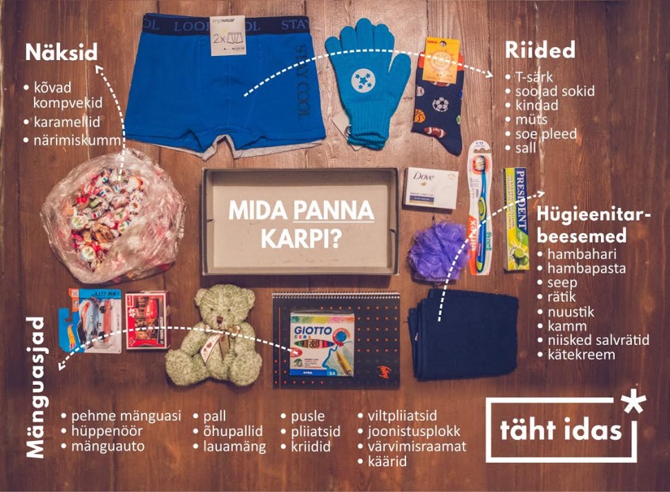 Leia mõni seisma jäänud kingakarp, otsusta, kas tahad kingitust teha 2-4, 5-9 või 10-14 aastasele lapsele ning täida see meelepäraste kingitustega. Eelistatud kingitused on sooneutraalsed, kuid kui tahad kingitust kindlasti teha just tüdrukule või poisile, tee ka sellekohane märge. Kodulehelt www.starintheeast.net saab printida välja juba meie poolt disainitud sildi. Kui kingitus sobib mõlemale, tee selge ristike mõlema soo kastidesse. Eelistatud ning ennast tõestanud kingitused on loovust arendavad nagu joonistamis- ja voolimisvahendid ning konstruktorid ja pusled. Midagi pehmet ja armsat nagu kaisukaru ning toredad ajaviitmisvahendid nagu pall ja muud mängud. Soojad riided nagu aluspesu, sokid, mütsid. Hügieeniabiks näiteks hambahari, hambapasta ja seep. Midagi magusat nagu näiteks karamellid ja muud klaaskommid (šokolaad võib kahjuks reisil sulada).