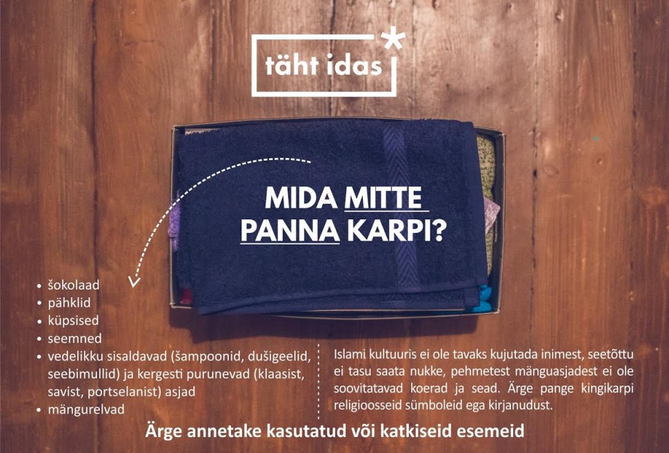 Sul pole aega karbi jaoks? Sa ei taha joosta ühest poest teise? Me teeme seda sinu asemel! 25 euro suurune annetus katab ühe karbi sisu ja logistikakulud. Sellel eesmärgil anneta ühingu Ühiskoonnatöö Sihtasutuse arvele viitega ”Tehke kingitus minu eest”. Annetused, mis on laekunud peale 12. detsembrit, me kahjuks enam ei jõua muuta karbiks, kuid see muutub seemneivaks järgmise aasta ürituse jaoks.