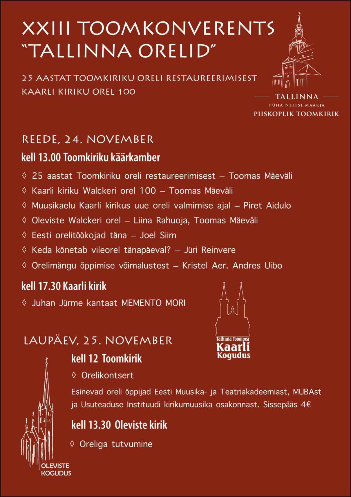 Olete väga oodatud XXIII toomkonverentsile “Tallinna orelid” toomkiriku käärkambris reedel, 24. novembril algusega kell 13.